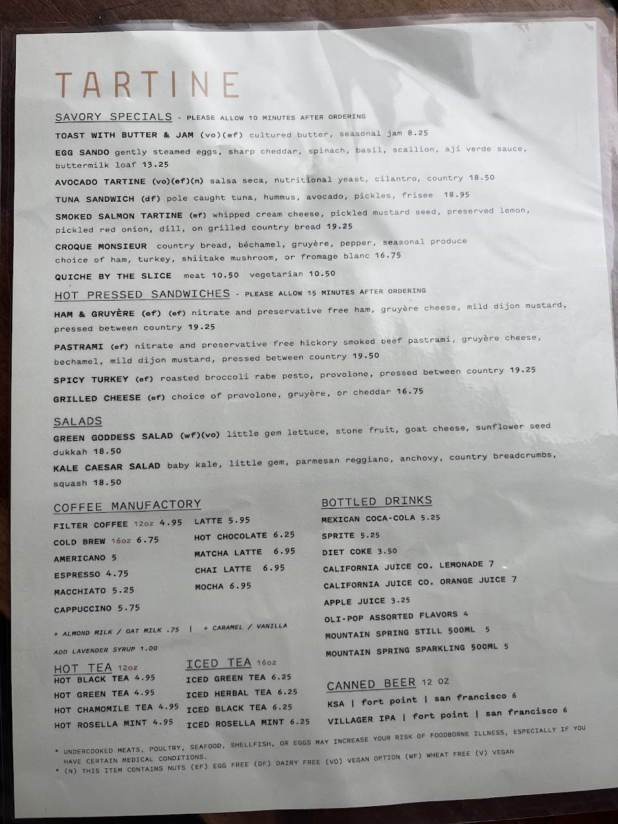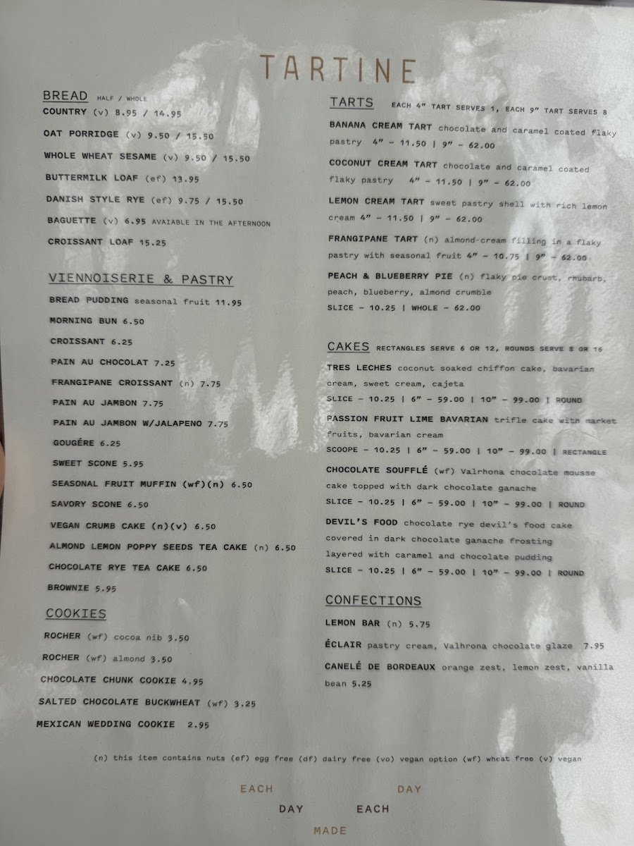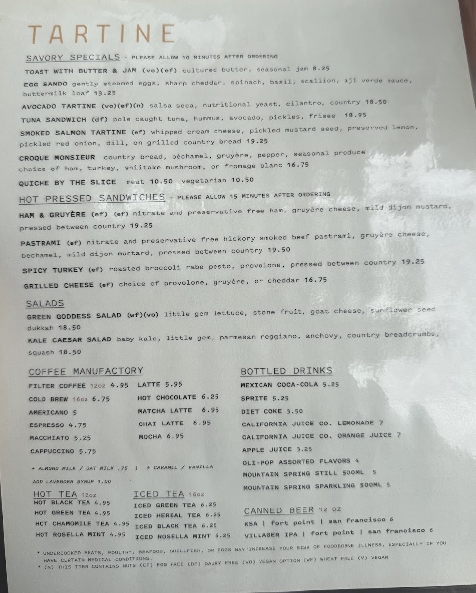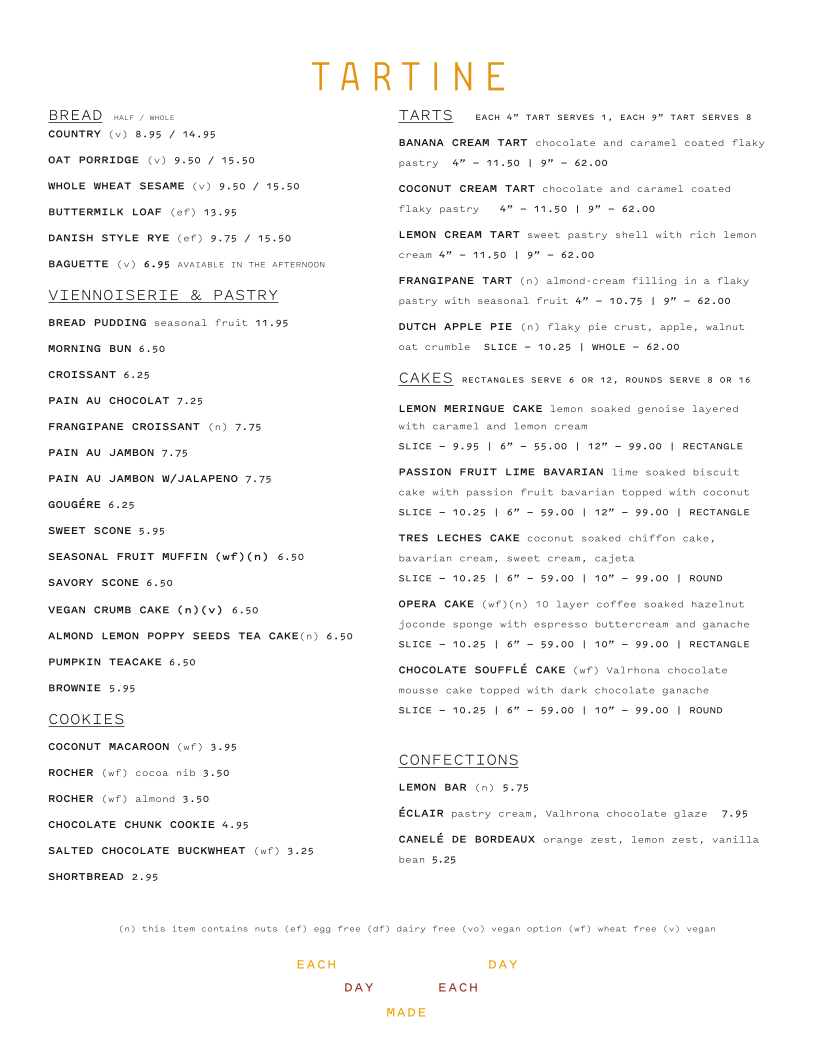 Tartine Bakery Menu